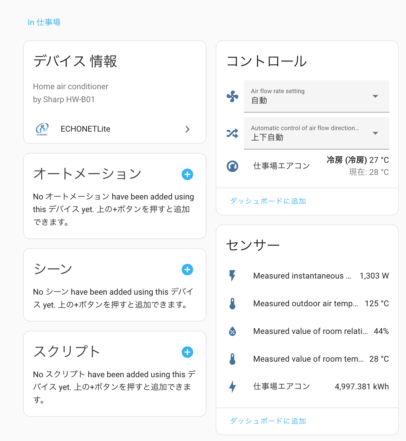 エアコンが登録されると以下のようにセンサーの情報取得とコントロールができるようになった。