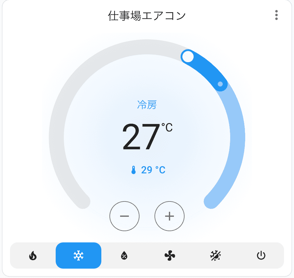 上記は Home Assistant に表示されるコントローラだ。 直感的にわかりやすく、現在の温度と設定温度の差が見やすくていい感じだ。
